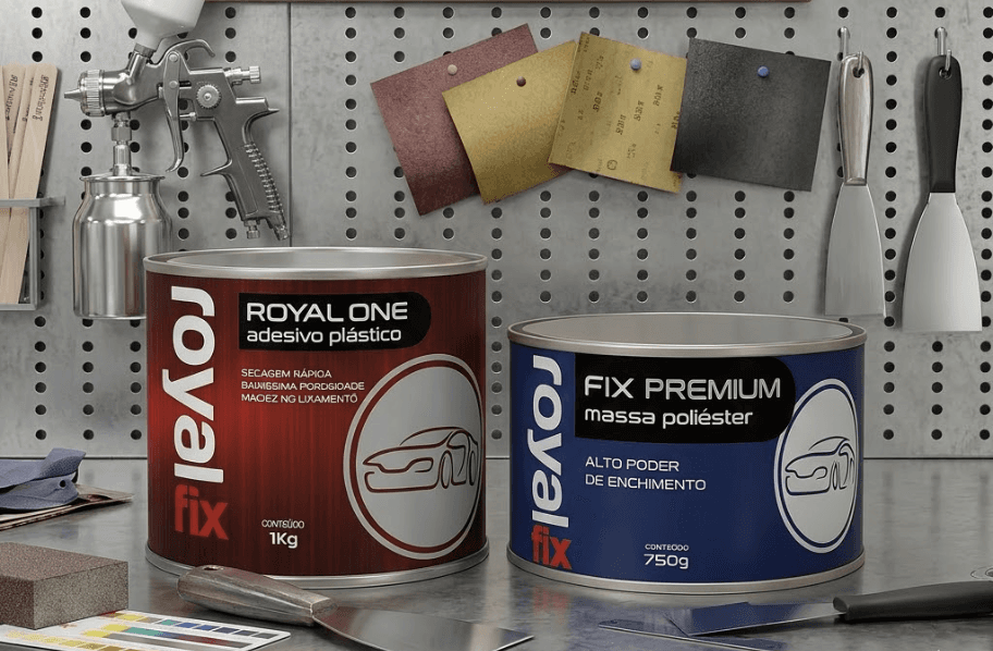 A Royal Fix oferece tanto a linha de massas poliéster quanto a linha de adesivos plásticos, com produtos para diferentes perfis de serviço e exigência técnica. Ter as duas linhas disponíveis significa ter a ferramenta certa para cada situação.
