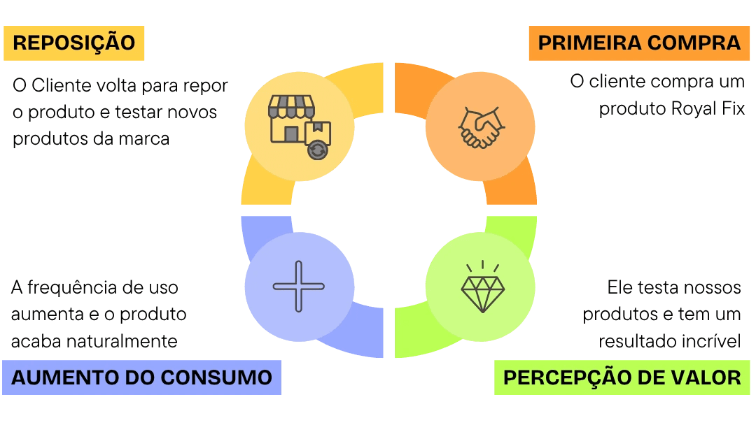 Primeira compra. O cliente experimenta um produto Royal Fix pela primeira vez — seja porque você indicou, porque ele viu na prateleira ou porque buscou uma solução para um problema específico.